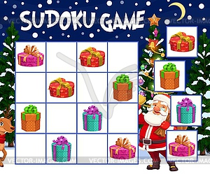 کوچولوی من بابانوئل توی تصویر 4 نوع جعبه کادو دارد. ازت می خواهم که آنها را طوری توی خانه های جدول قرار بدهی که در هیچ سطر یا ستونی کادوی تکراری وجود نداشته باشد.
