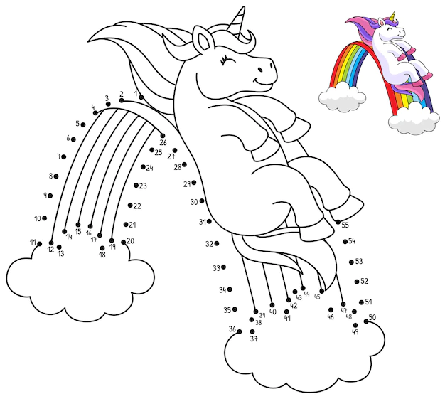 با وصل کردن نقطه ها برای این تک شاخ زیبا یک رنگین کمان بکشید و رنگ کنید
