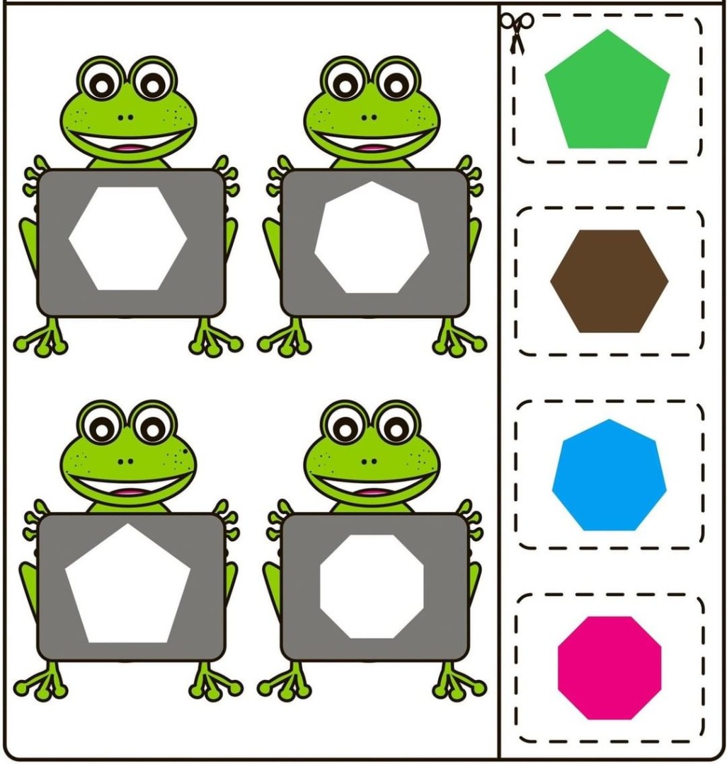 به شکل های هندسی گوشه تصویر نگاه کنید و بگویید هر کدام از آنها کدام قورباغه را کامل میکند