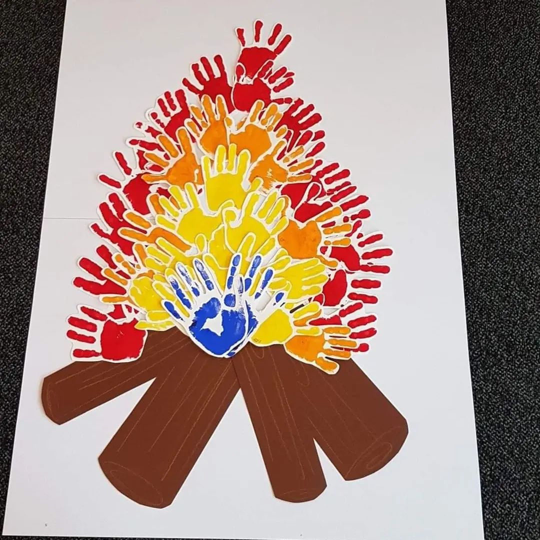 با کاغذ رنگی تنه ی درخت بکشید و دورش رو ببرید و کلی دست ریز در رنگ های ابی و زرد و نارنجی و قرمز درست کنید و روی یک کاغذ بچسبونیدش